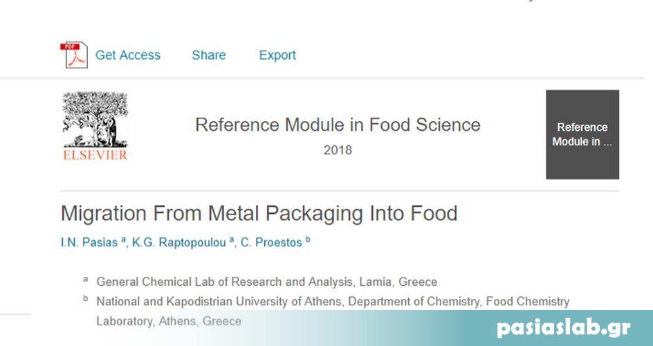 Με περηφάνια σας παρουσιάζουμε τη νέα μεγάλη επιστημονική δημοσίευση του Γενικού Χημείου Έρευνας και Αναλύσεων "Πασιάς-Ραπτοπούλου" που έγινε δεκτή στο διεθνές επιστημονικό περιοδικό με κριτές Reference Module in Food Science. Η δημοσίευση πραγματοποιήθηκε σε συνεργασία με τον επίκουρο καθηγητή κ. Προεστό Χαράλαμπο του τμήματος Χημείας του Εθνικού και Καποδιστριακού Πανεπιστημίου Αθηνών και αφορά τη μετανάστευση των υλικών συσκευασίας στα τρόφιμα ευρείας κατανάλωσης.