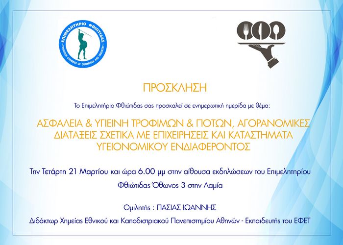 Το Επιμελητήριο Φθιώτιδας σας προσκαλεί στην ενημερωτική ημερίδα που οργανώνει με θέμα "Ασφάλεια και Υγιεινή Τροφίμων και Ποτών, Αγορανομικές διατάξεις σχετικά με επιχειρήσεις και καταστήματα Υγειονομικού Ενδιαφέροντος" την Τετάρτη 21 Μαρτίου και ώρα 6.00 μμ στην αίθουσα εκδηλώσεων του Επιμελητηρίου, Όθωνος 3, Λαμία.