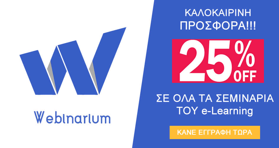Το καλοκαίρι τελειώνει και μαζί η του η προσφορά μας για τα e-learning. Έως 31 Αυγούστου με εγγραφή σας σε όποιο e-learning επιθυμείτε κερδίζετε άμεσα έκπτωση 25% για την παρακολούθηση του χρησιμοποιώντας τον κωδικό κουπονιού summer2019.